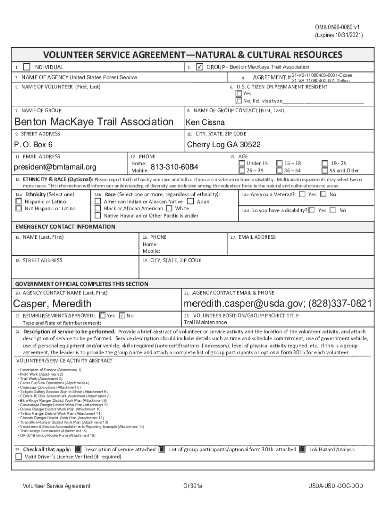 OMB 05960080 v1 (Expires 131/)VOLUNTEER SERVICE AGREEMENTNATURAL & CULTURAL RESOURCES INDIVIDUAL1. 3.NAME OF AGENCY United States Forest Service5.NAME OF VOLUNTEER (First, Last)7.NAME OF GROUP6.8.STREET