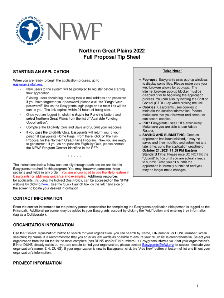 Northern Great Plains 2022 Full Proposal Tip Sheet STARTING AN APPLICATION When you are ready to begin the application process, go to easy grants.NFF.org. New users to the system will be prompted