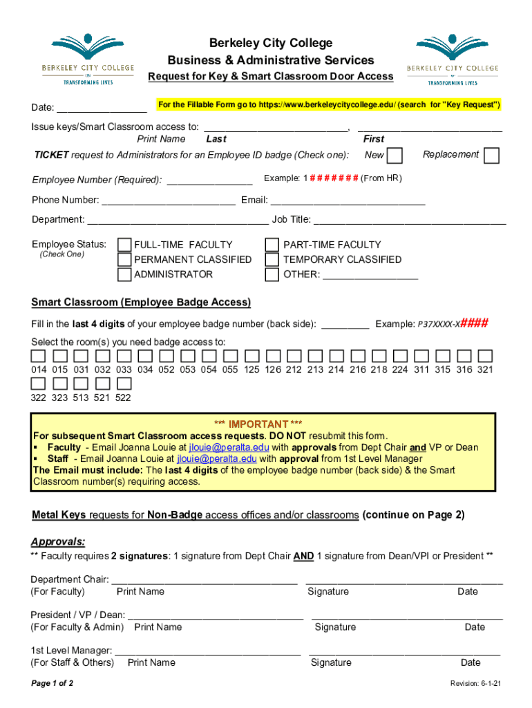 Berkeley City College Business & Administrative Services Request for Key & Smart Classroom Door Access Date: ___For the Fillable Form go to https://www.berkeleycitycollege.edu/ (search for \” Key