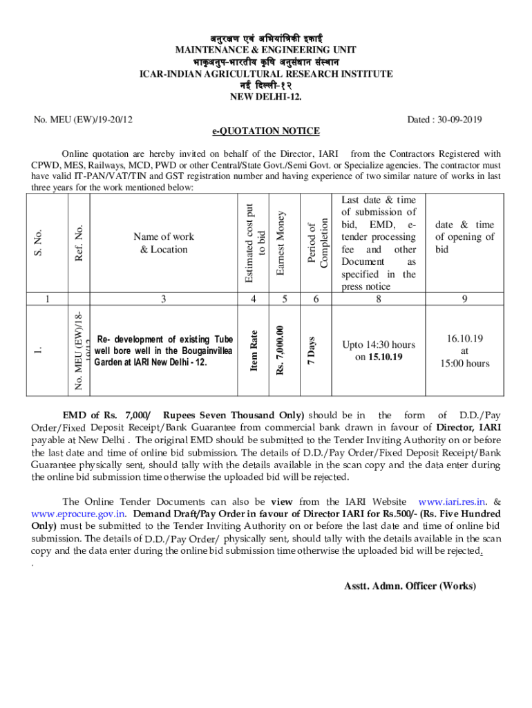 MAINTENANCE & ENGINEERING UNIT AMERINDIAN AGRICULTURAL RESEARCH INSTITUTE NEW DELHI12. No. ME (EW)/1920/12Dated : 30092019 quotation NOTICE56Re development of existing Tube well bore in the Bougainvillea