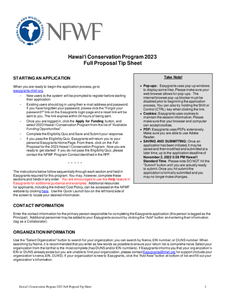 Hawaii Conservation Program 2023 Full Proposal Tip Sheet STARTING AN APPLICATION When you are ready to begin the application process, go to easy grants.NFF.org. New users to the system will be prompted