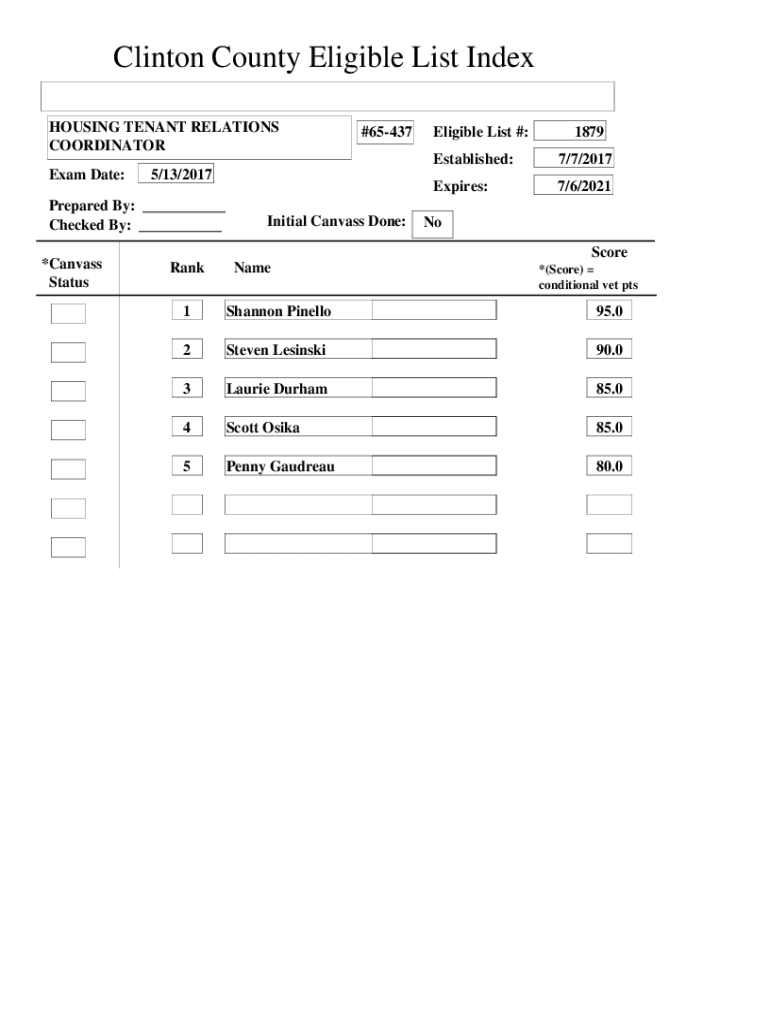Clinton County Eligible List Index HOUSING TENANT RELATIONS COORDINATOR Exam Date:5/13/2017Prepared By: ___ Checked By: ___ *Canvass Status#65437Initial Canvass Done:Eligible List #:1879Established:7/7/2017Expires:7/6/2021No