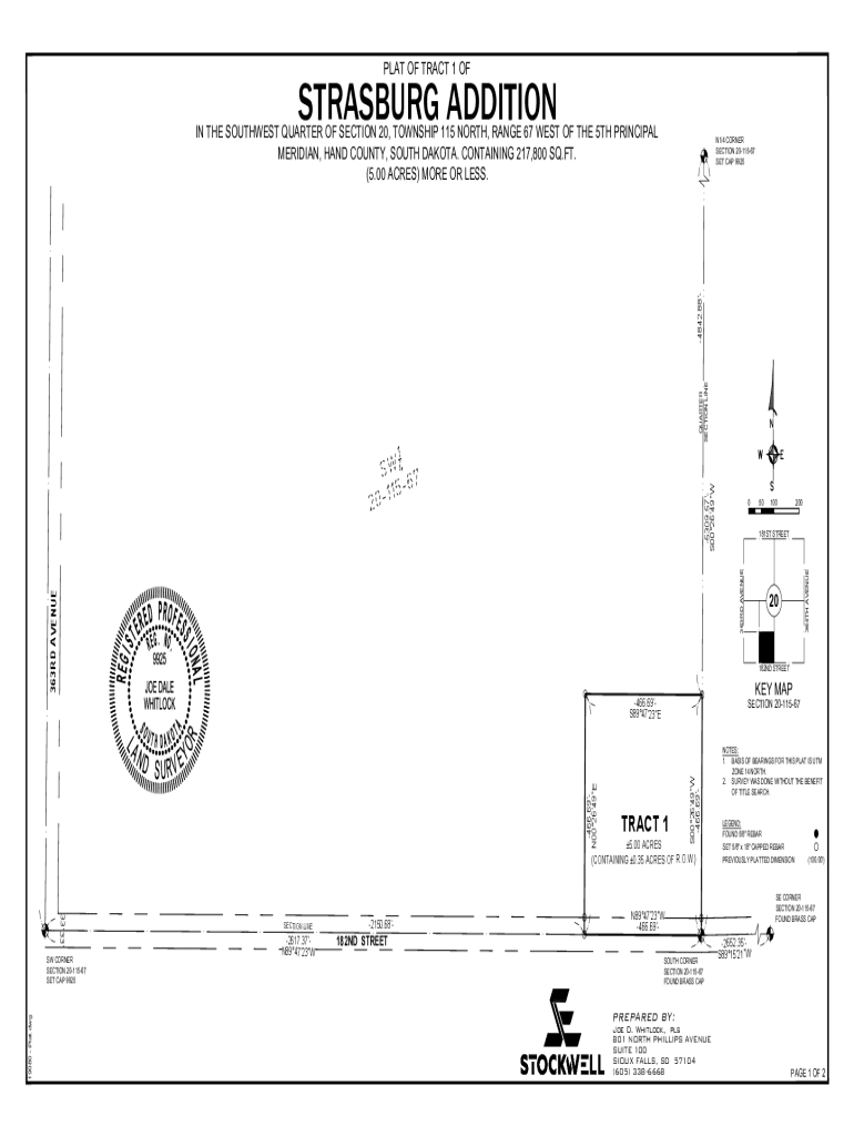 PLAT OF TRACT 1 STRASBOURG ADDITION IN THE SOUTHWEST QUARTER OF SECTION 20, TOWNSHIP 115 NORTH, RANGE 67 WEST OF THE 5TH PRINCIPAL MERIDIAN, HAND COUNTY, SOUTH DAKOTA. CONTAINING 217,800 SQ.FT. (5.00