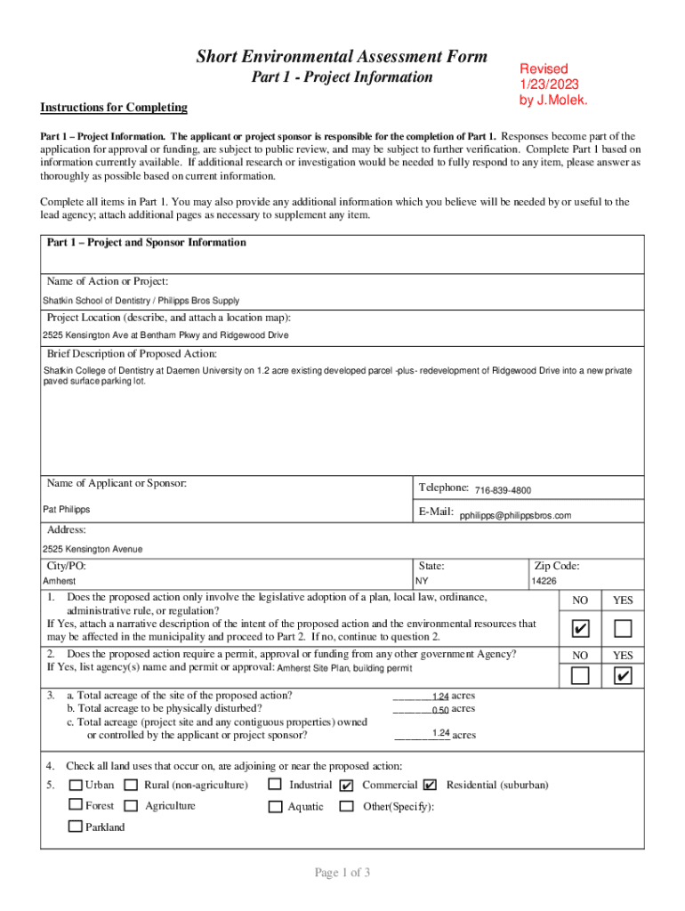 Short Environmental Assessment Form Part 1 Project Information Instructions for CompletingRevised 1/23/2023 by J. Mole. Part 1 Project Information. The applicant or project sponsor is responsible