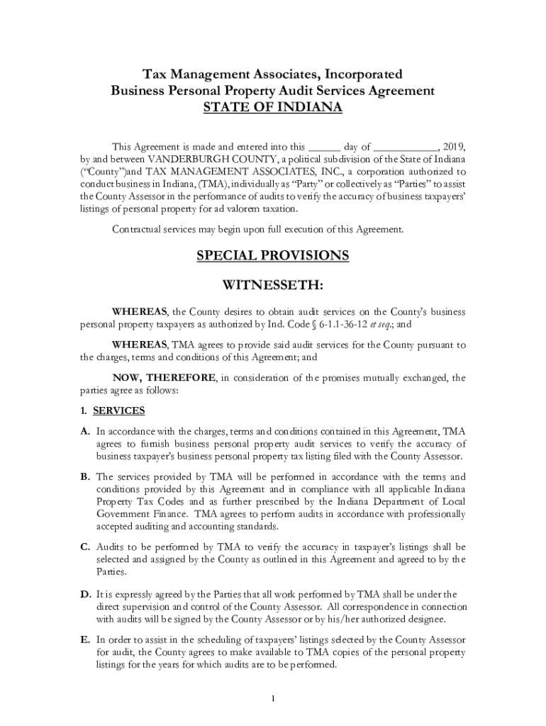 Tax Management Associates, Incorporated Business Personal Property Audit Services Agreement STATE OF INDIANA This Agreement is made and entered into this ___ day of ___, 2019, by and between VANDENBERG