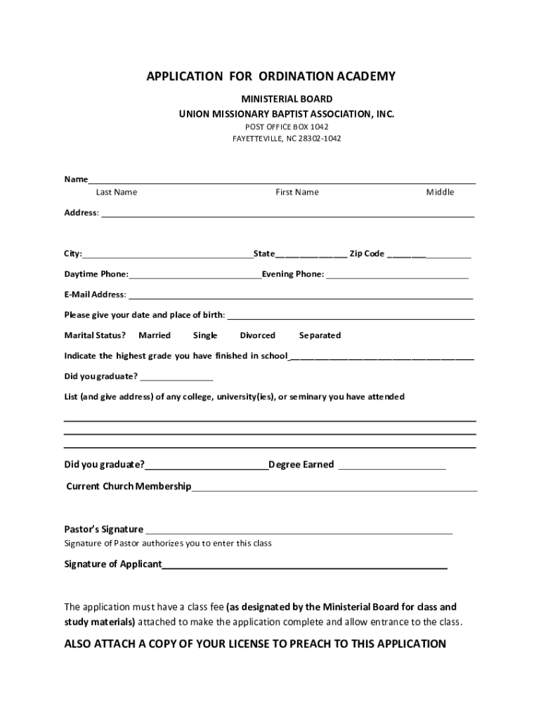 APPLICATIONFORORDINATION ACADEMYMINISTERIAL BOARDUNION MISSIONARY BAPTIST ASSOCIATION, INC.POST OFFICE BOX 1042FAYETTEVILLE, NC 283021042Name