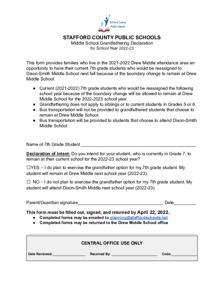 STAFFORD COUNTY PUBLIC SCHOOLS Middle School Grandfathering Declaration for School Year 202223This form provides families who live in the 20212022 Drew Middle attendance area an opportunity to have