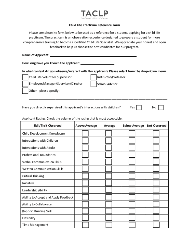 Child Life Practicum Reference Form Please complete the form below to be used as a reference for a student applying for a child life practicum. The practicum is an observation experience designed