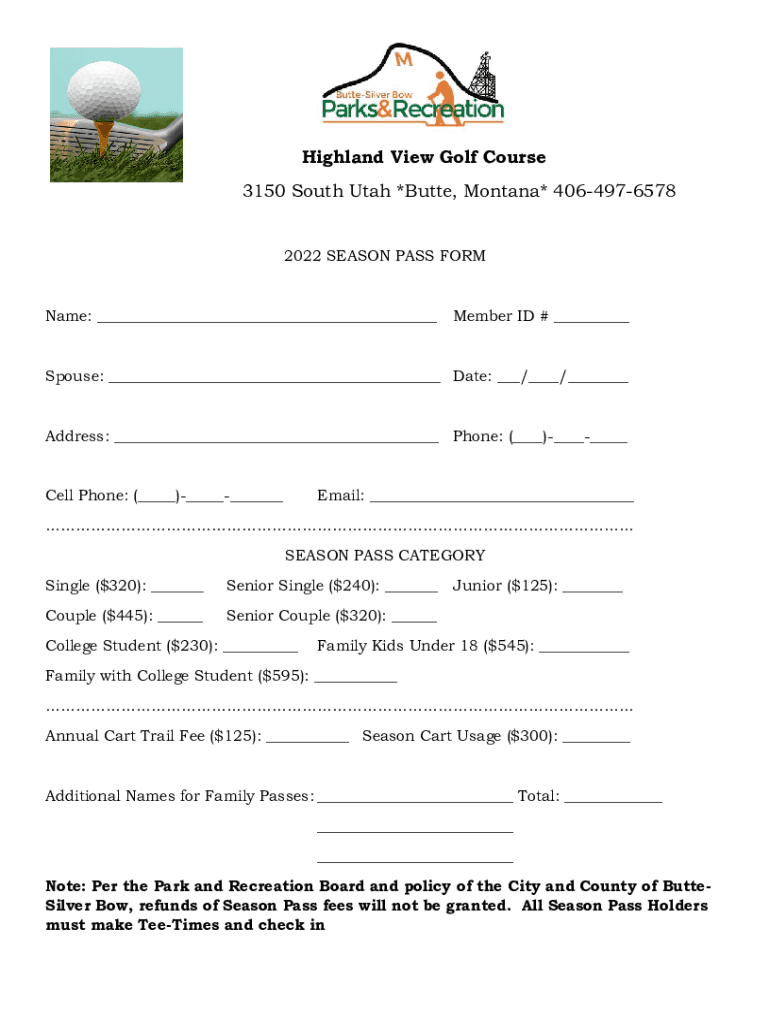 Highland View Golf Course 3150 South Utah *Butte, Montana* 4064976578 2022 SEASON PASS Forename: ___Member ID # ___Spouse: ___ Date: ___/___/___Address: ___ Phone: (___)______Cell Phone: (___)______Email: