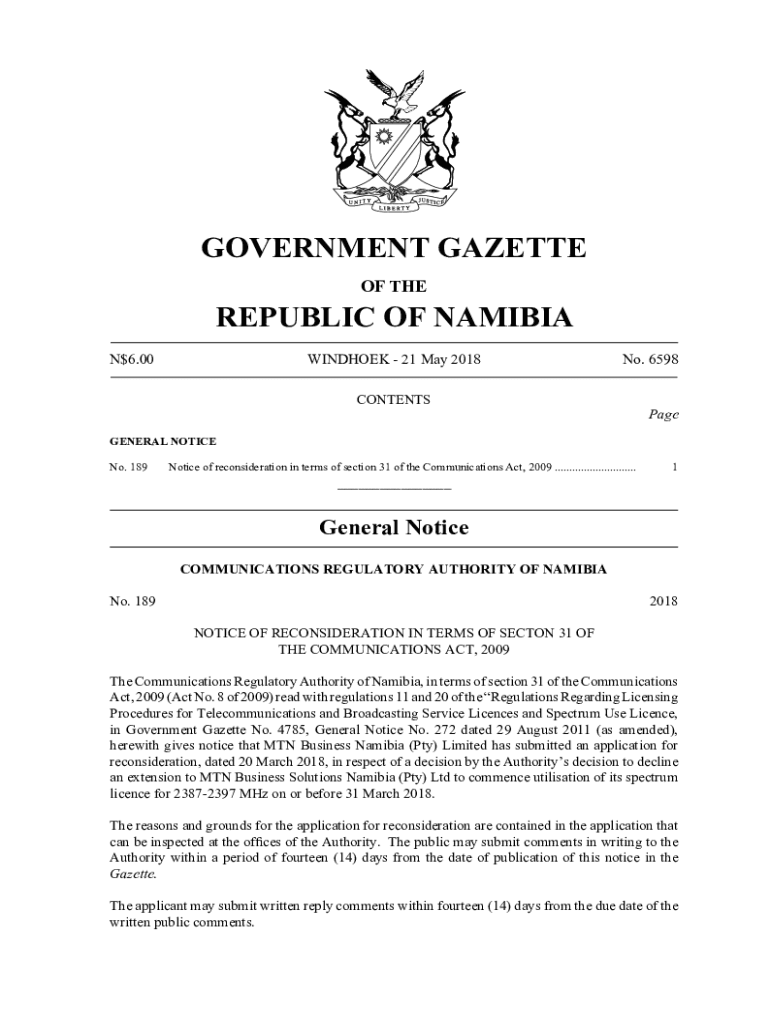 GOVERNMENT GAZETTE OF REPUBLIC OF NAMIBIA N$6.00WINDHOEK 21 May 2018 No. 6598 CONTENTSPageGENERAL NOTICE No. 189Notice of reconsideration in terms of section 31 of the Communications Act, 2009 .............................1___General