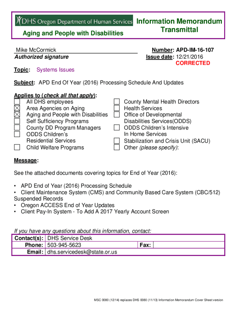 Aging and People with Disabilities Mike McCormick Authorized signature Topic:Information Memorandum Transmittal Number: APDIM16107 Issue date: 12/21/2016 CORRECTEDSystems IssuesSubject: APD End Of