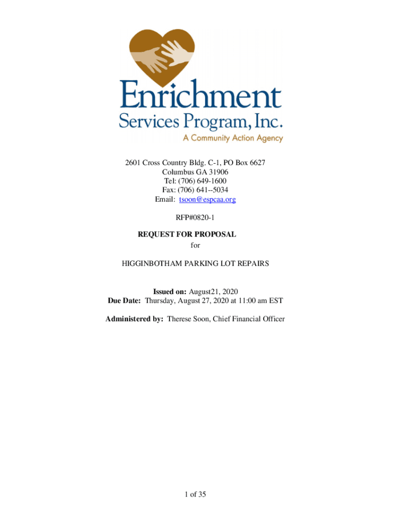 2601 Cross Country Bldg. C1, PO Box 6627 Columbus GA 31906 Tel: (706) 6491600 Fax: (706) 6415034 Email: tsoon@espcaa.org RFP#08201 REQUEST FOR PROPOSAL for HIGGINBOTHAM PARKING LOT REPAIRSIssued on: