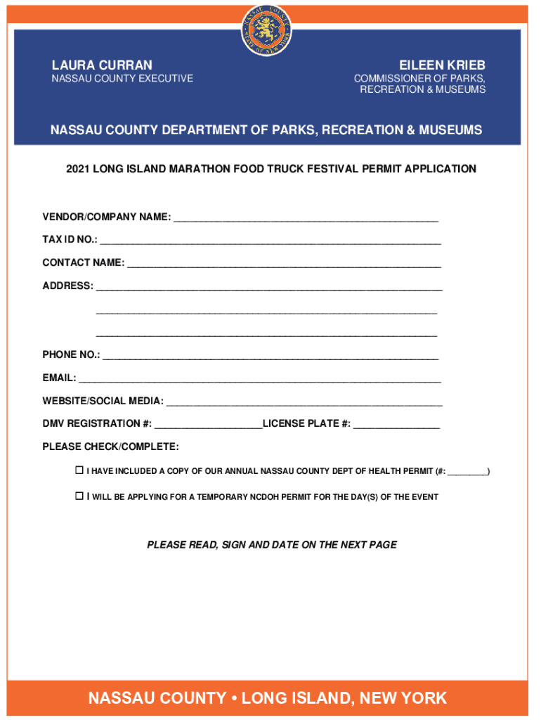 LAURA CURRANT NASSAU COUNTY EXECUTIVEEILEEN TRIED COMMISSIONER OF PARKS, RECREATION & MUSEUMSNASSAU COUNTY DEPARTMENT OF PARKS, RECREATION & MUSEUMS 2021 LONG ISLAND MARATHON FOOD TRUCK FESTIVAL PERMIT