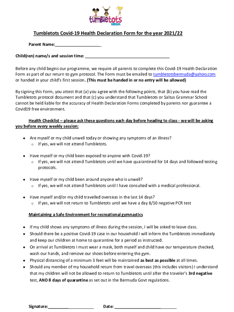 Tumble tots COVID-19 Health Declaration Form for the year 2021/22 Parent Name:_Child(men) name/s and session time: Before any child begins our program, we require all parents to complete this COVID-19