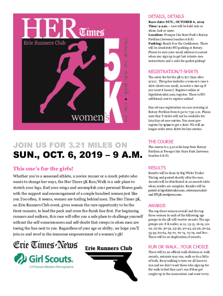 DETAILS, DETAILS Race date: SUN., OCTOBER 6, 2019, Time: 9 a.m. Race will be held rain or shine, hail or snow. Location: Pressure Isle State Parks Rotary Pavilion (between beaches 6 & 8) Parking:
