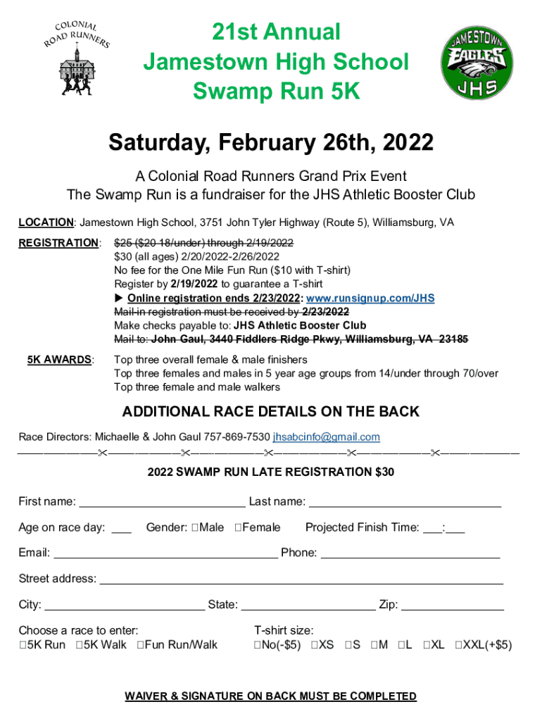 21st Annual Jamestown High School Swamp Run 5K Saturday, February 26th, 2022 A Colonial Road Runners Grand Prix Event The Swamp Run is a fundraiser for the JHS Athletic Booster Club LOCATION: Jamestown