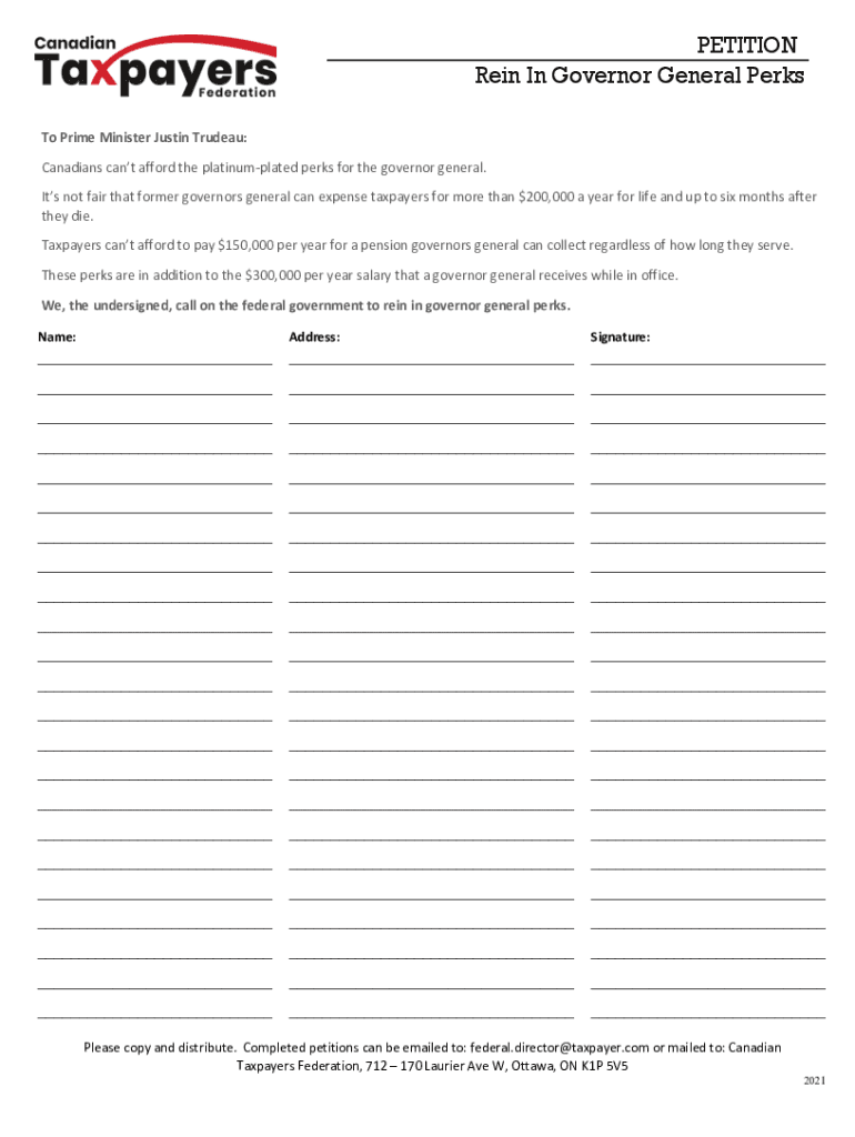 PETITION Rein In Governor General Perks To Prime Minister Justin Trudeau: Canadians can't afford the platinum plated perks for the governor general. It's not fair that former governors general can