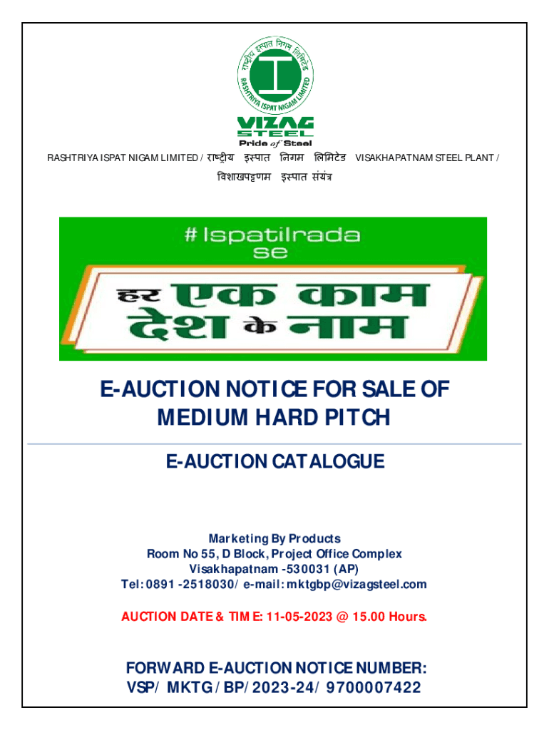 ASHTRAY SPAT NI GAM LIMITED / VISAKHAPATNAM STEEL PLANT / AUCTION NOTICE FOR SALE OF MEDIUM HARD PITCH AUCTION CATALOGUEMarketing By Products Room No 55, D Block, Project Office Complex Visakhapatnam