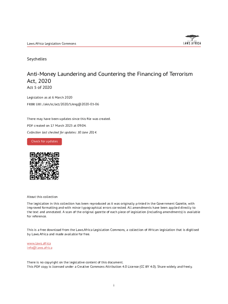 Laws. Africa Legislation CommonsSeychellesAntiMoney Laundering and Countering the Financing of Terrorism Act, 2020 Act 5 of 2020 Legislation as at 6 March 2020 FRBR URI: /AKN/SC/act/2020/5/eng@20200306There