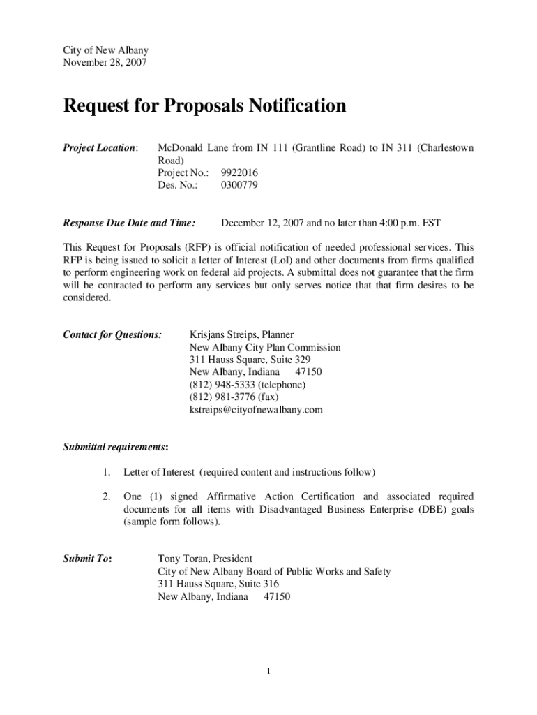 City of New Albany November 28, 2007Request for Proposals Notification Project Location:McDonald Lane from IN 111 (Grant line Road) to IN 311 (Charlestown Road) Project No.: 9922016 DES. No.: 0300779Response