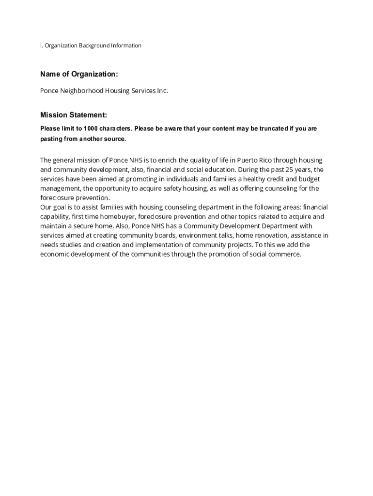 I. Organization Background Informational of Organization: Ponce Neighborhood Housing Services Inc. Mission Statement: Please limit to 1000 characters. Please be aware that your content may be truncated