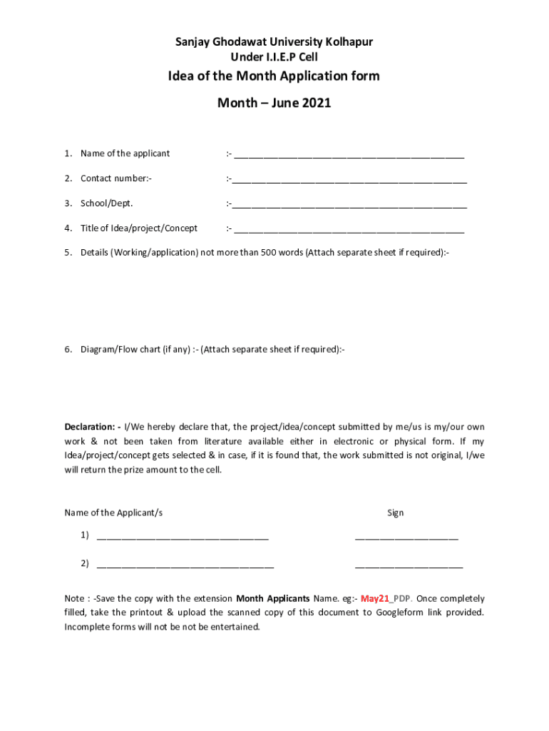 Sanjay Geodata University Kolhapur Under I.I.E.P Collided of the Month Application form Month June 20211. Name of the applicant: ___2. Contact number::___3. School/Dept.:___4. Title of Idea/project/Concept: