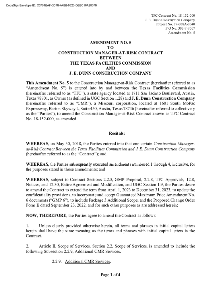 DocuSign Envelope ID: C3751EAF0D784ABB9523DEEC16A20078TFC Contract No. 18152000 J. E. Dunn Construction Company Project No. 17008A8040 P O No. 30377007 Amendment No. 5AMENDMENT NO. 5 TO CONSTRUCTION
