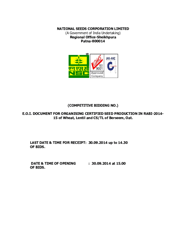 NATIONAL SEEDS CORPORATION LIMITED (A Government of India Undertaking) Regional OfficeSheikhpura Patna800014(COMPETITIVE BIDDING NO.) E.O.I. DOCUMENT FOR Organizing CERTIFIED SEED PRODUCTION IN RABI201415