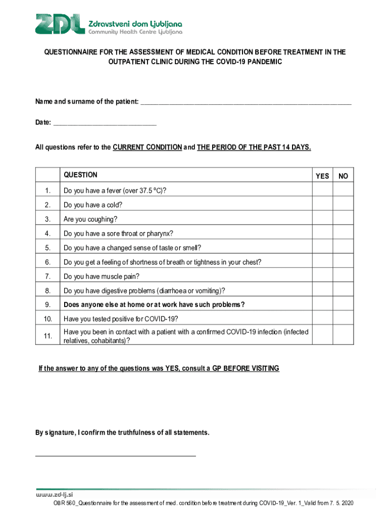 QUESTIONNAIRE FOR THE ASSESSMENT OF MEDICAL CONDITION BEFORE TREATMENT IN THE OUTPATIENT CLINIC DURING THE COVID-19 PANDEMICName and surname of the patient: ___ Date: ___ All questions refer to the