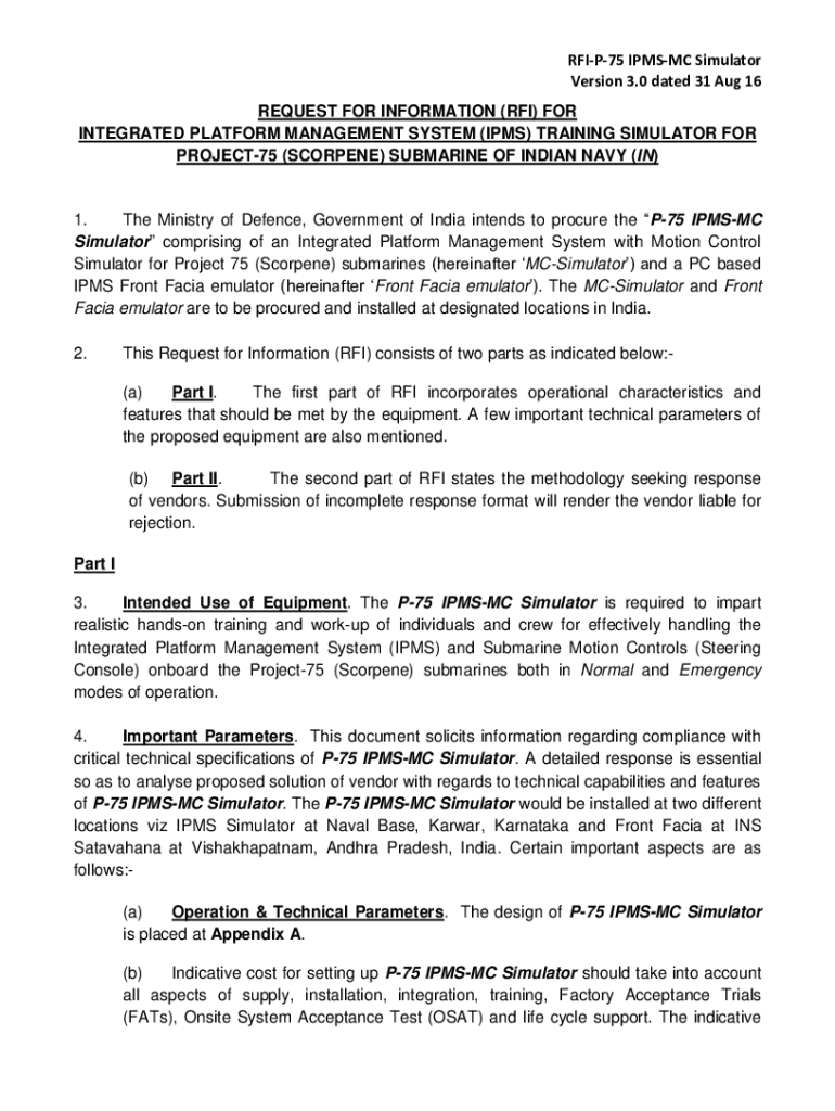 RFIP75 IPM SMC Simulator Version 3.0 dated 31 Aug 16 REQUEST FOR INFORMATION (RFI) FOR INTEGRATED PLATFORM MANAGEMENT SYSTEM (IPS) TRAINING SIMULATOR FOR PROJECT75 (SCORSESE) SUBMARINE OF INDIAN NAVY
