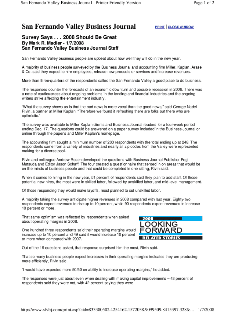 San Fernando Valley Business Journal Printer Friendly Version San Fernando Valley Business Journal Page 1 of 2PRINT| CLOSE WINDOWSurvey Says. . . 2008 Should Be Great By Mark R. Adler 1/7/2008 San