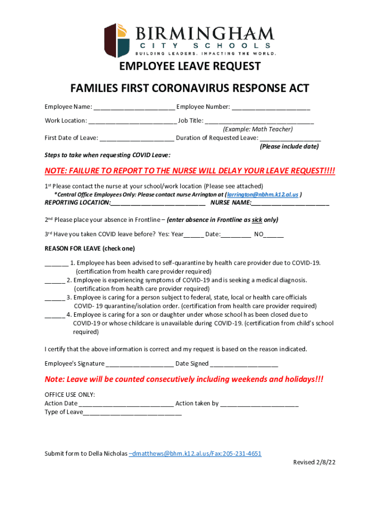 EMPLOYEE LEAVE REQUEST FAMILIES FIRST CORONAVIRUS RESPONSE ACT Employee Name: ___ Employee Number: ___ Work Location: ___ Job Title: ___ (Example: Math Teacher) First Date of Leave: ___ Duration of