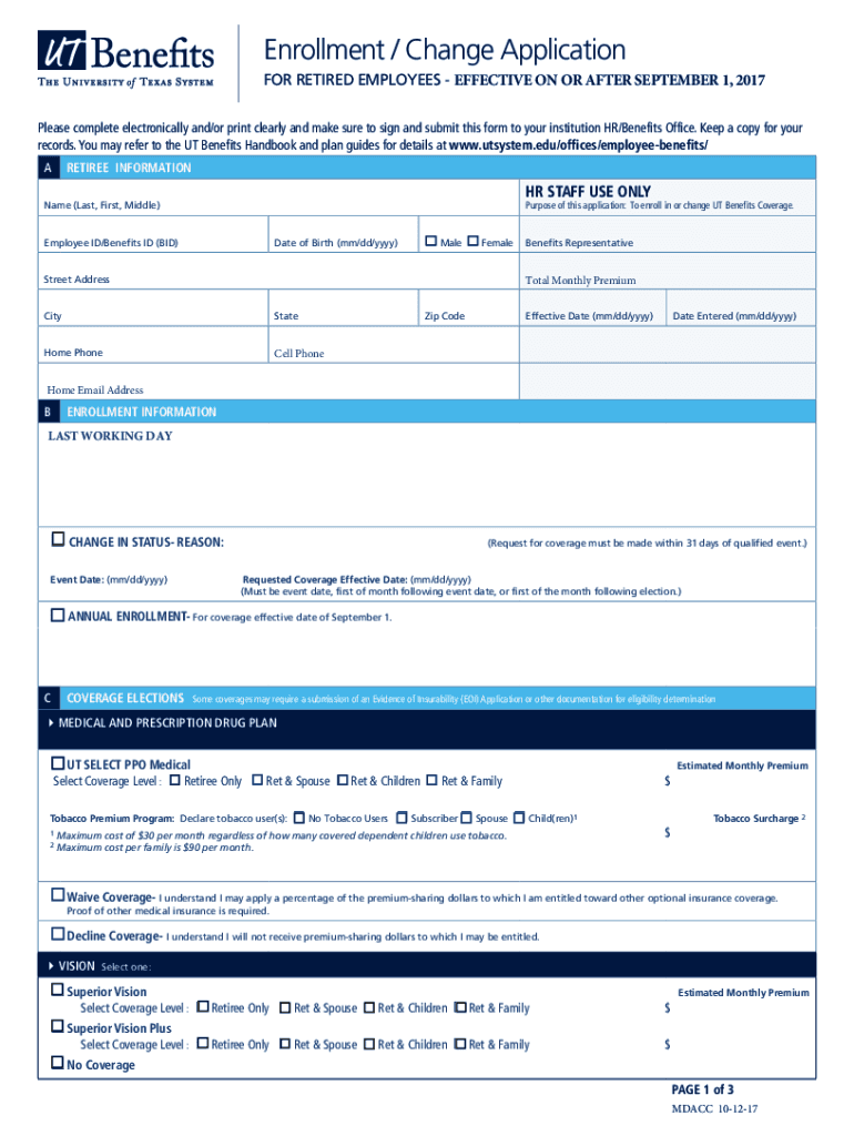 Enrollment / Change Application FOR RETIRED EMPLOYEES EFFECTIVE ON OR AFTER SEPTEMBER 1, 2017, Please complete electronically and/or print clearly and make sure to sign and submit this form to your