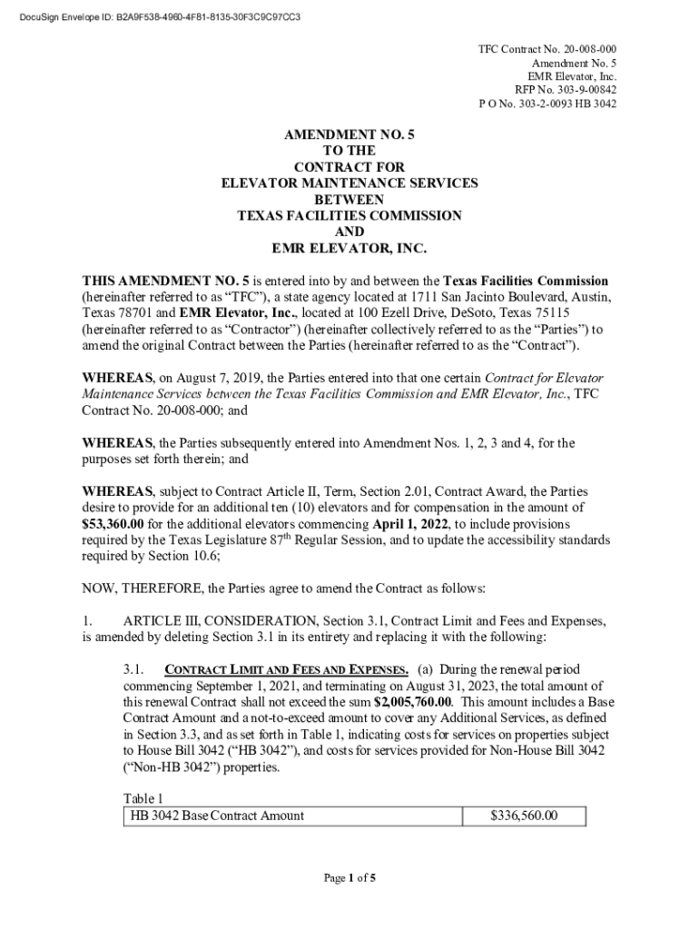 DocuSign Envelope ID: B2A9F53849604F81813530F3C9C97CC3TFC Contract No. 20008000 Amendment No. 5 EMR Elevator, Inc. RFP No. 303900842 P O No. 30320093 HE 3042AMENDMENT NO. 5 TO THE CONTRACT FOR ELEVATOR