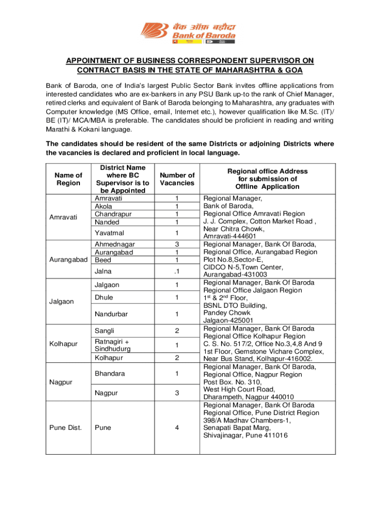 APPOINTMENT OF BUSINESS CORRESPONDENT SUPERVISOR ON CONTRACT BASIS IN THE STATE OF MAHARASHTRA & GOA Bank of Baroda, one of India's the largest Public Sector Bank invites offline applications from