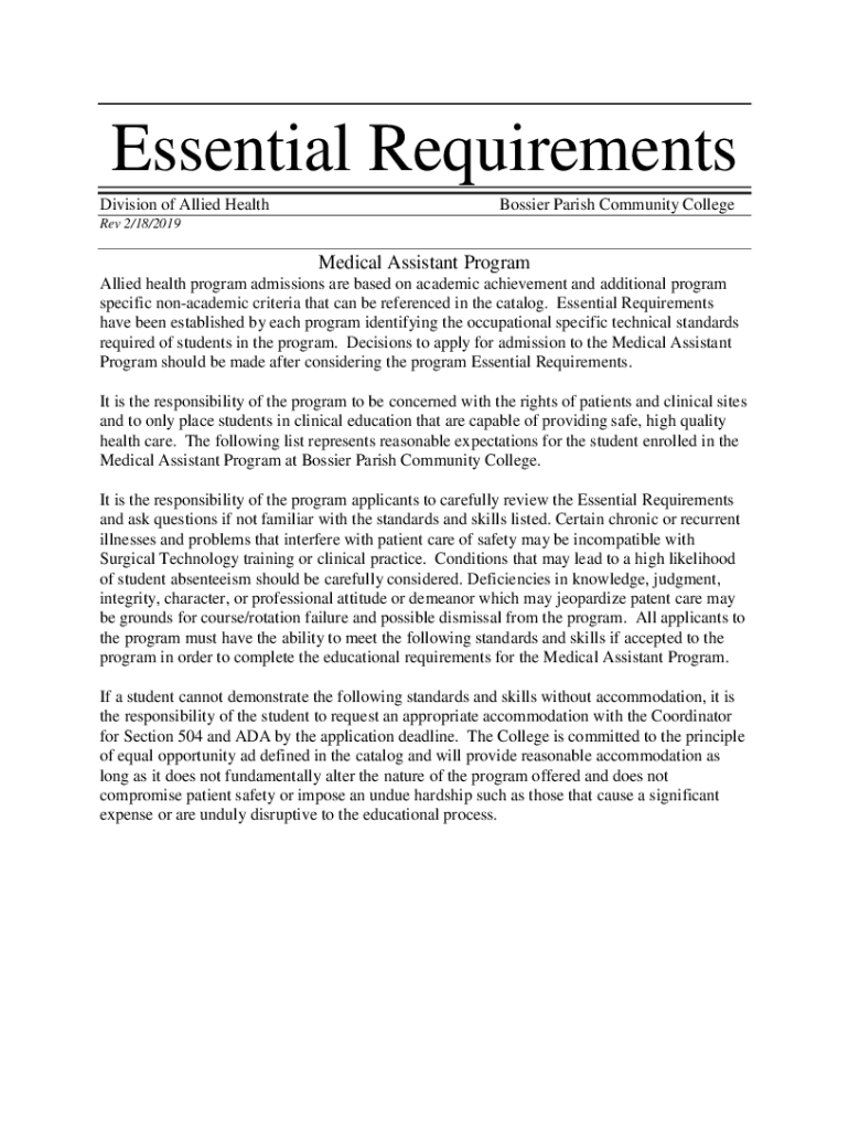 Essential Requirements Division of Allied HealthBossier Parish Community College Rev 2/18/2019Medical Assistant Program Allied health program admissions are based on academic achievement and additional