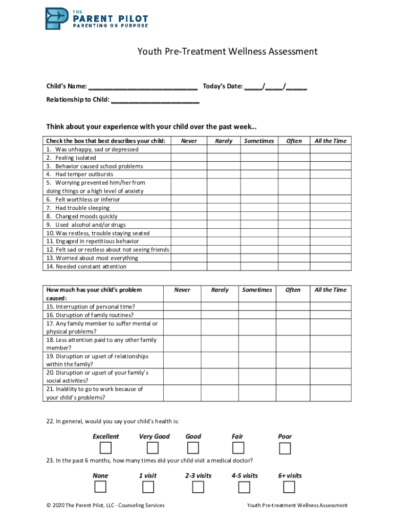 Youth PreTreatment Wellness Assessment Child's Name: ___ Today's Date: ___/___/___ Relationship to Child: ___Think about your experience with your child over the past week Check the box that best