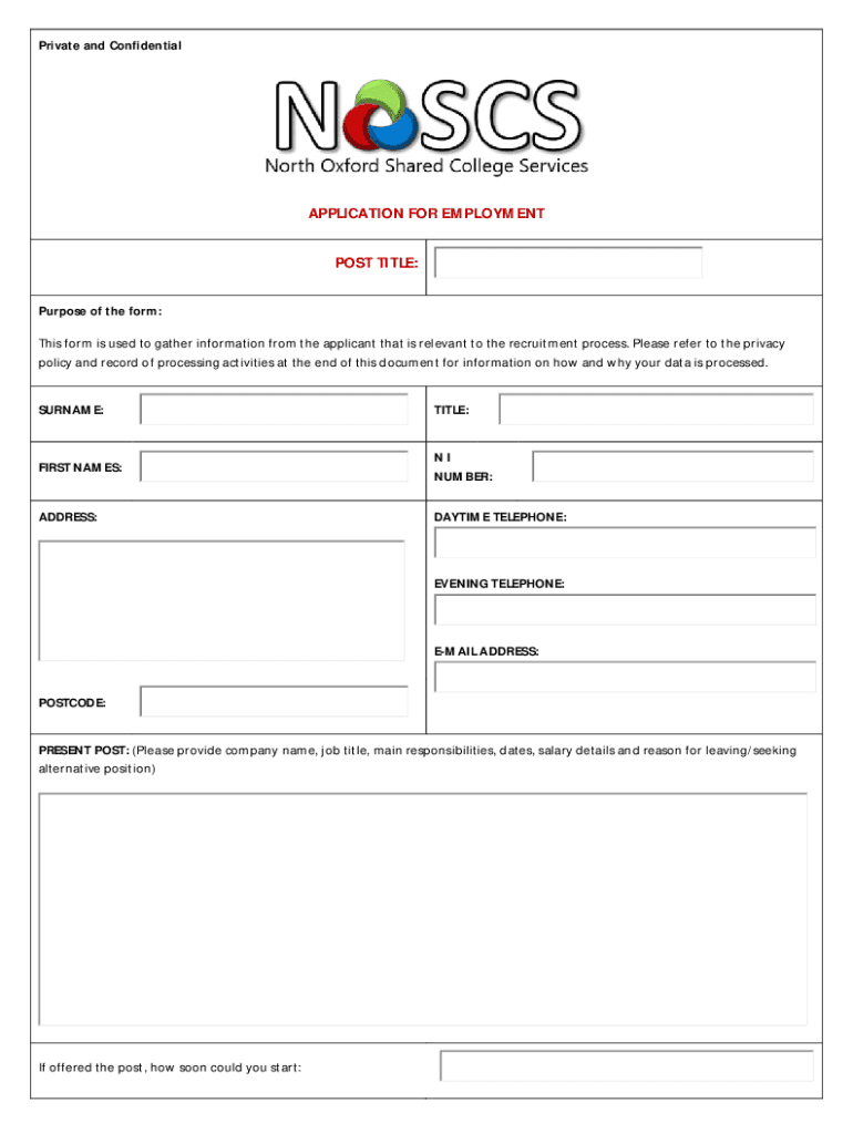 Private and ConfidentialAPPLICATION FOR EMPLOYMENT POST TITLE: Purpose of the form: This form is used to gather information from the applicant that is relevant to the recruitment process. Please refer