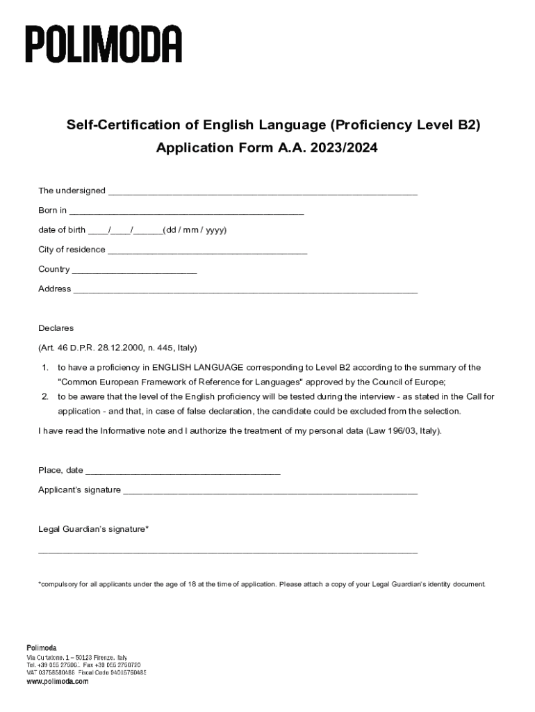 Recertification of English Language (Proficiency Level B2) Application Form A.A. 2023/2024 The undersigned ___ Born in ___ date of birth ___/___/___(dd / mm / YYY) City of residence ___ Country ___