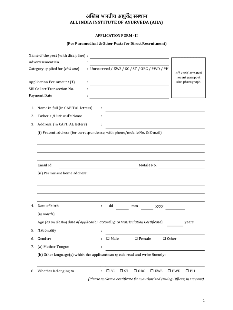 ALL INDIA INSTITUTE OF AYURVEDA (ASIA) APPLICATION FORM II (For Paramedical & Other Posts for Direct Recruitment) Name of the post (with discipline) : Advertisement No.:Category applied for (tick
