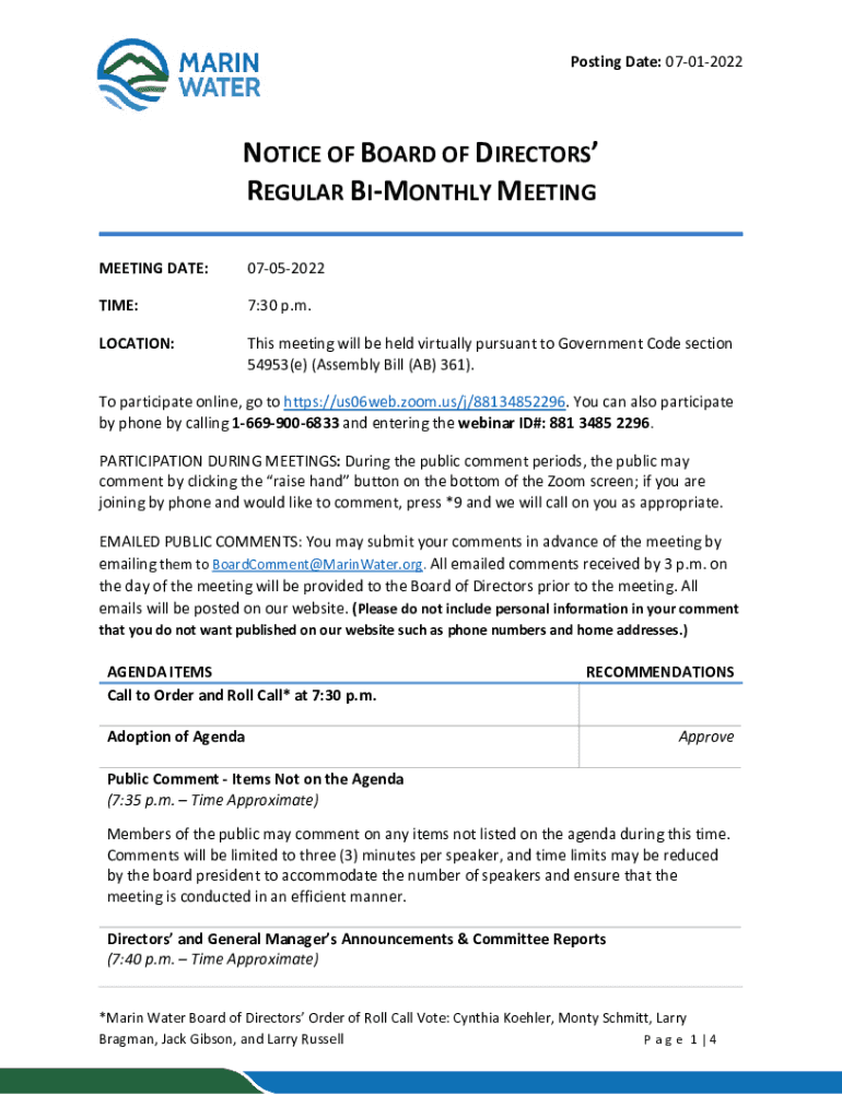 Posting Date: 07012022NOTICE OF BOARD OF DIRECTORS REGULAR BIMONTHLY MEETING DATE:07052022TIME:7:30 p.m.LOCATION:This meeting will be held virtually pursuant to Government Code section 54953(e) (Assembly