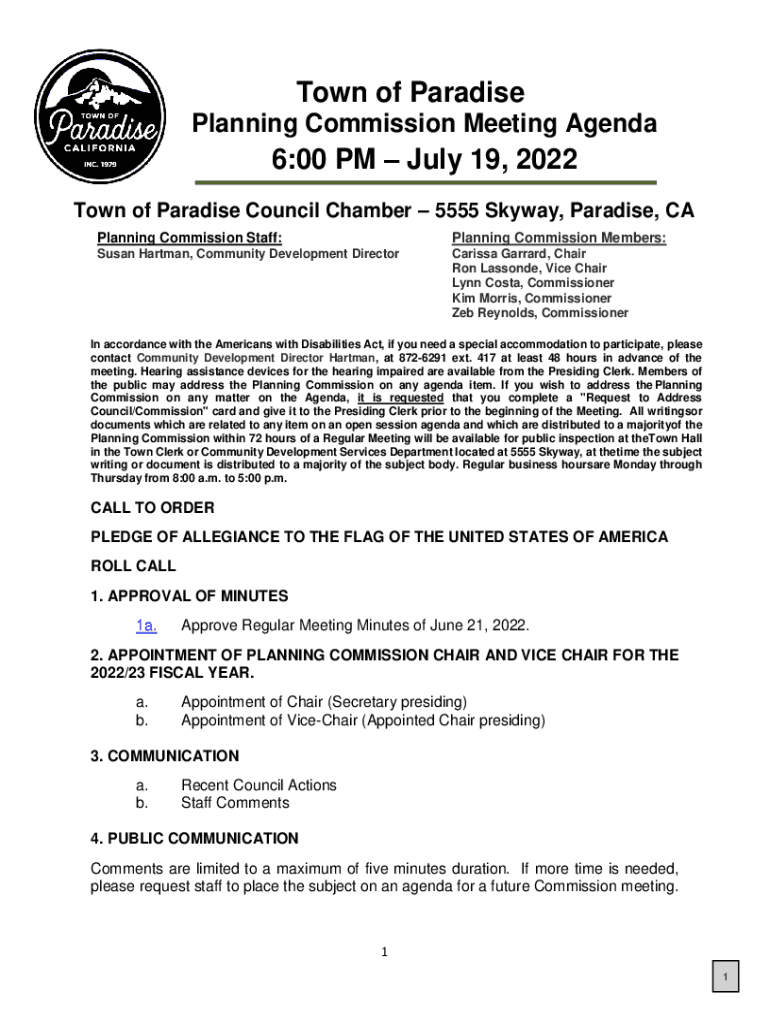 Town of Paradise Planning Commission Meeting Agenda6:00 PM July 19, 2022, Town of Paradise Council Chamber 5555 Skyway, Paradise, CA Planning Commission Staff:Planning Commission Members:Susan Hartman,