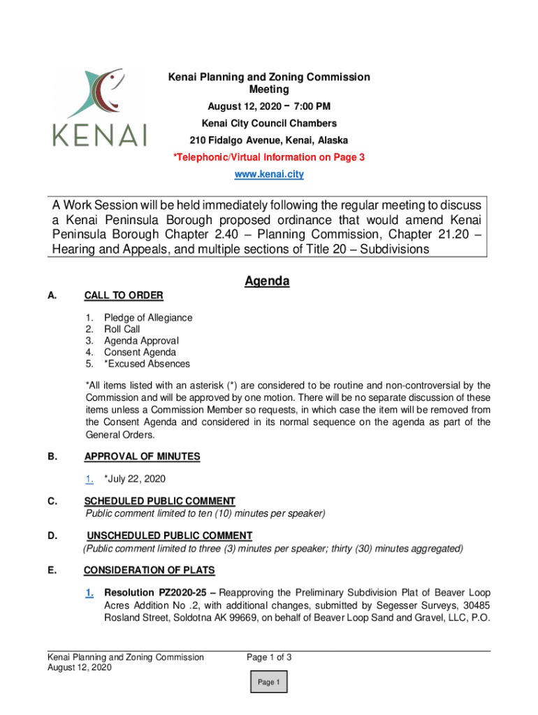 Kenji Planning and Zoning Commission Meeting August 12, 2020 7:00 PM Kenji City Council Chambers 210 Hidalgo Avenue, Kenji, Alaska *Telephonic/Virtual Information on Page 3 www.kenai.cityA Work Session