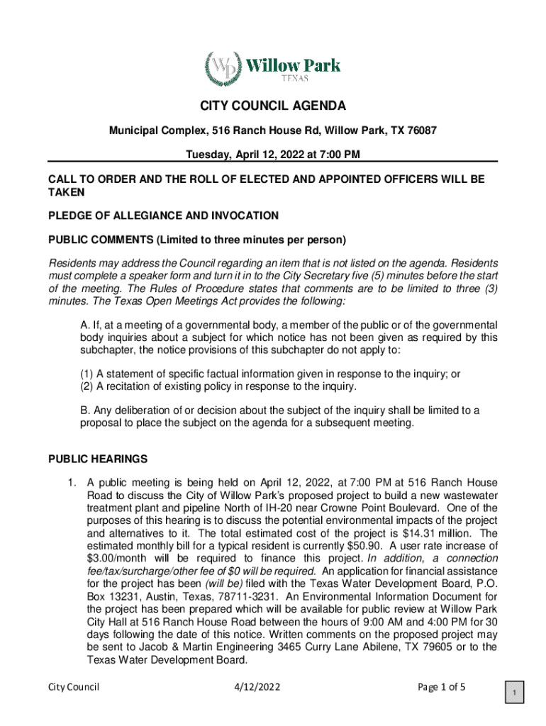 CITY COUNCIL AGENDA Municipal Complex, 516 Ranch House Rd, Willow Park, TX 76087 Tuesday, April 12, 2022, at 7:00 PM CALL TO ORDER AND THE ROLL OF ELECTED AND APPOINTED OFFICERS WILL BE TAKEN PLEDGE