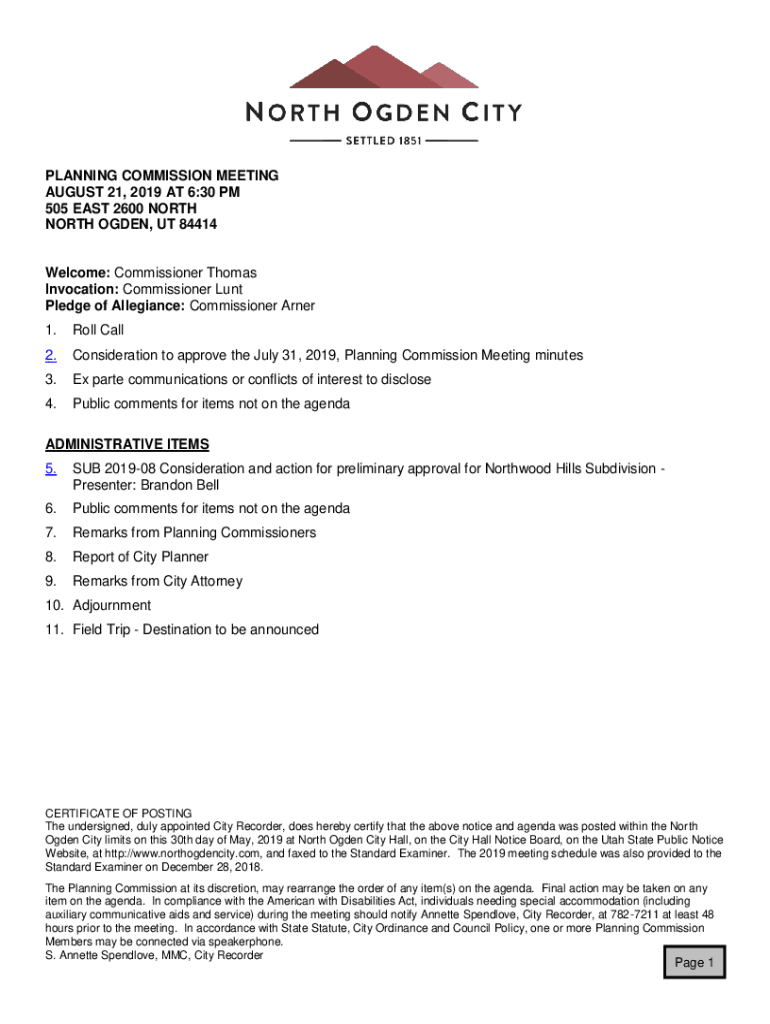 PLANNING COMMISSION MEETING AUGUST 21, 2019, AT 6:30 PM 505 EAST 2600 NORTH OGDEN, UT 84414 Welcome: Commissioner Thomas Invocation: Commissioner Aunt Pledge of Allegiance: Commissioner Warner 1.