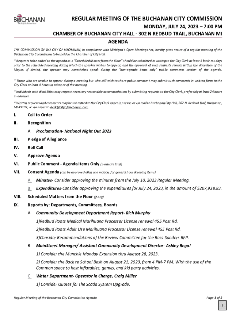 REGULAR MEETING OF THE BUCHANAN CITY COMMISSION MONDAY, JULY 24, 2023 7:00 PM CHAMBER OF BUCHANAN CITY HALL 302 N REDBUD TRAIL, BUCHANAN MI AGENDA THE COMMISSION OF THE CITY OF BUCHANAN, in compliance