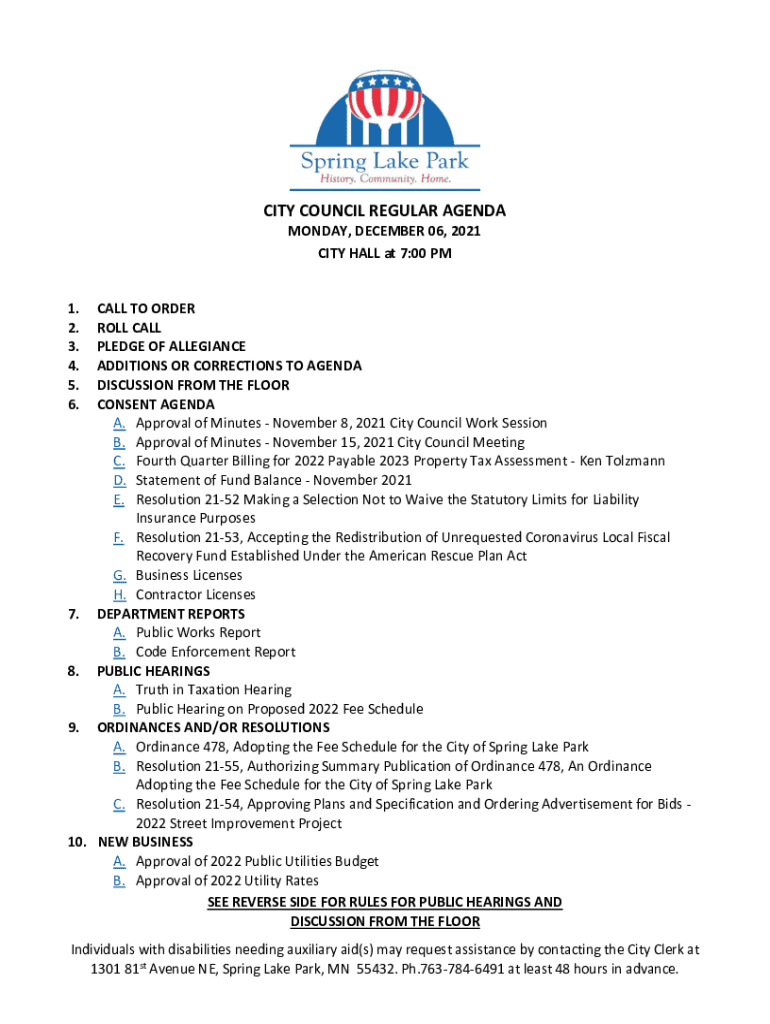 CITY COUNCIL REGULAR AGENDA MONDAY, DECEMBER 06, 2021, CITY HALL at 7:00 PM1. 2. 3. 4. 5. 6.CALL TO ORDER ROLL CALL PLEDGE OF ALLEGIANCE ADDITIONS OR CORRECTIONS TO AGENDA DISCUSSION FROM THE FLOOR