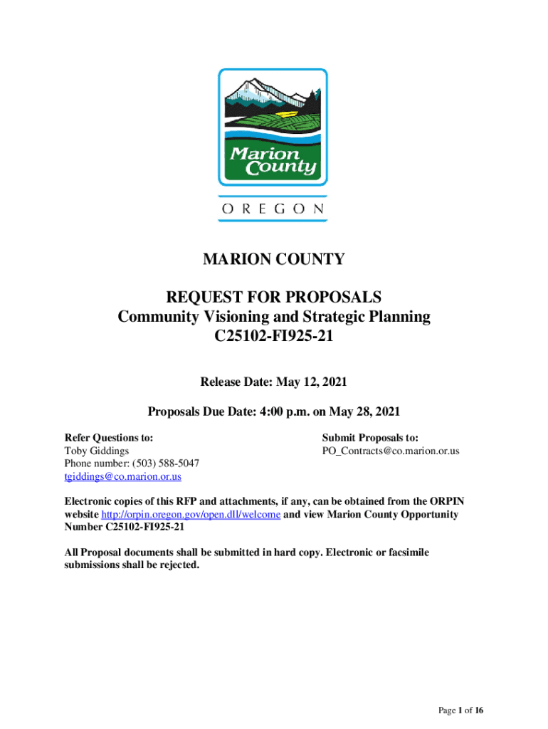 MARION COUNTY REQUEST FOR PROPOSALS Community Visioning and Strategic Planning C25102FI92521 Release Date: May 12, 2021, Proposals Due Date: 4:00 p.m. on May 28, 2021, Refer Questions to: Toby Giddings
