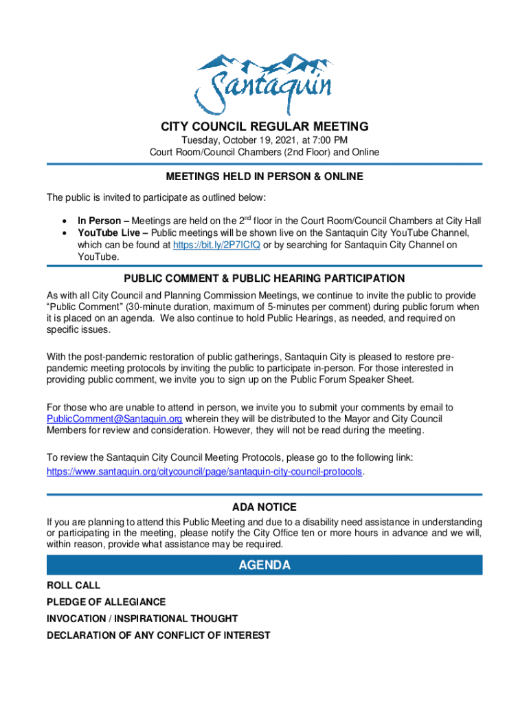 CITY COUNCIL REGULAR MEETING Tuesday, October 19, 2021, at 7:00 PM Court Room/Council Chambers (2nd Floor) and OnlineMEETINGS HELD IN PERSON & ONLINE The public is invited to participate as outlined