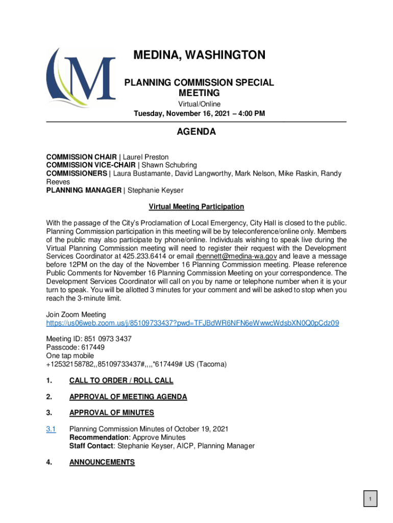 MEDINA, WASHINGTON PLANNING COMMISSION SPECIAL MEETING Virtual/Online Tuesday, November 16, 2021 4:00 AGENDA COMMISSION CHAIR | Laurel Preston COMMISSION DECKCHAIR | Shawn Scouring COMMISSIONERS |